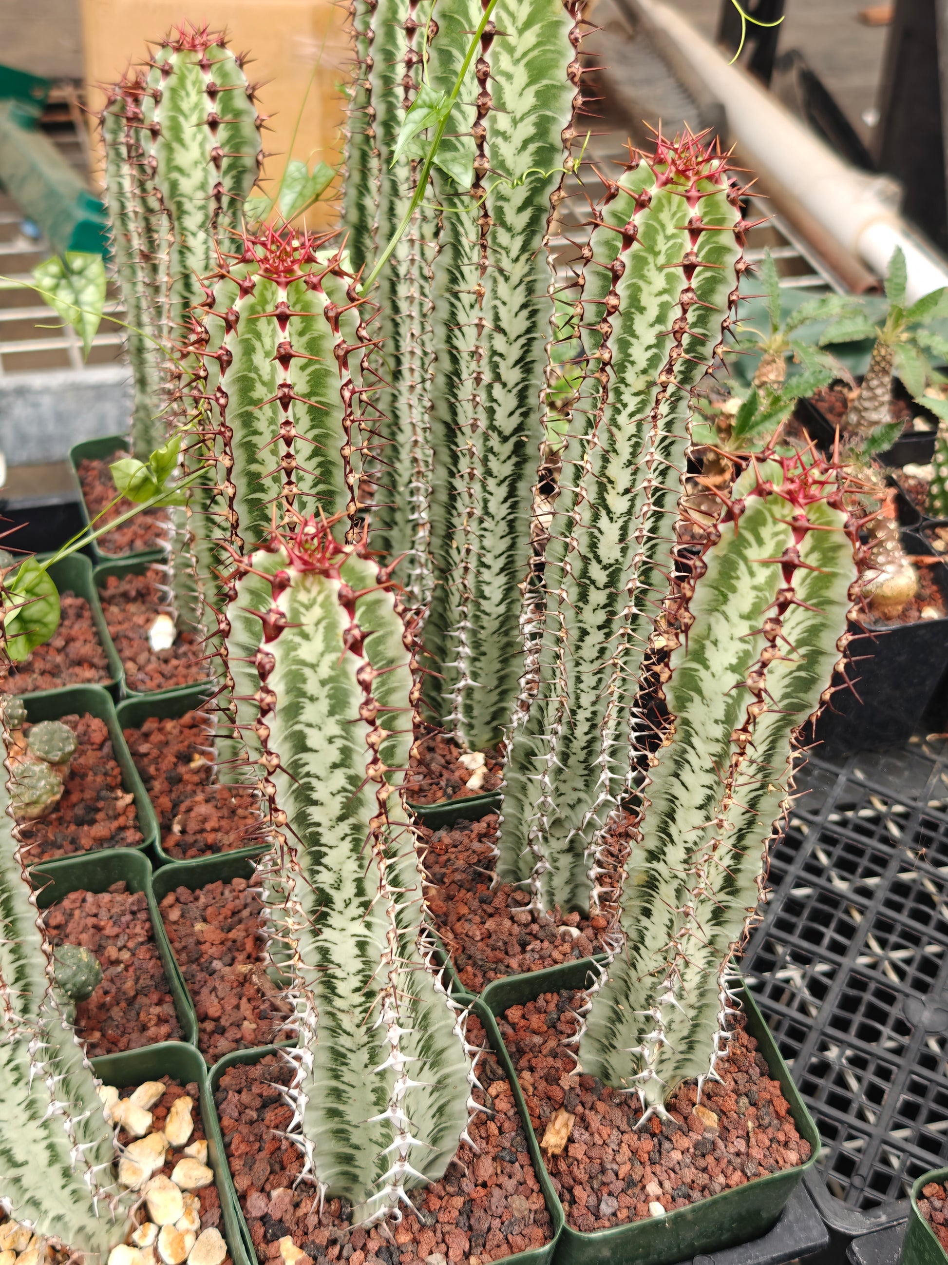Euphorbia confinalis ssp. rhodesia is a tall, columnar succulent, native to southern Africa, that resembles a cactus. Beautiful pattern on the body. Fast growing and plant may double in height in a year. 3.25" pot. Easy to care. Ships bare root.